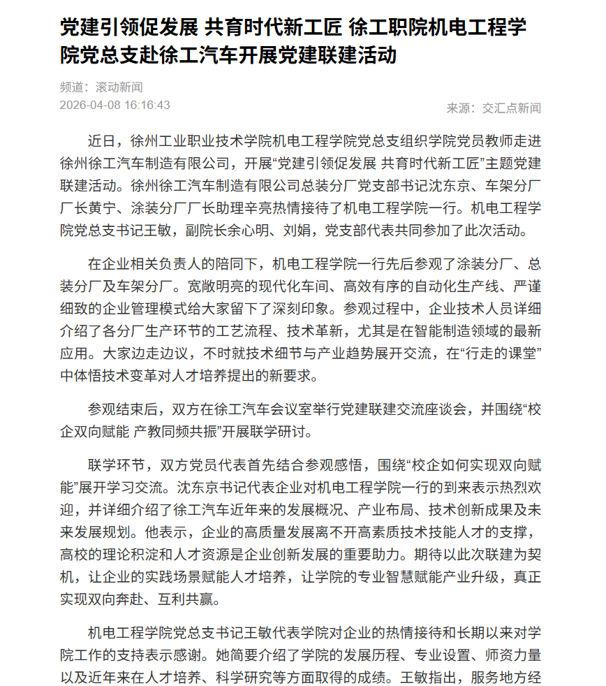 【新华日报·交汇点】党建引领促发展 共育时代新工匠 徐工职院机...