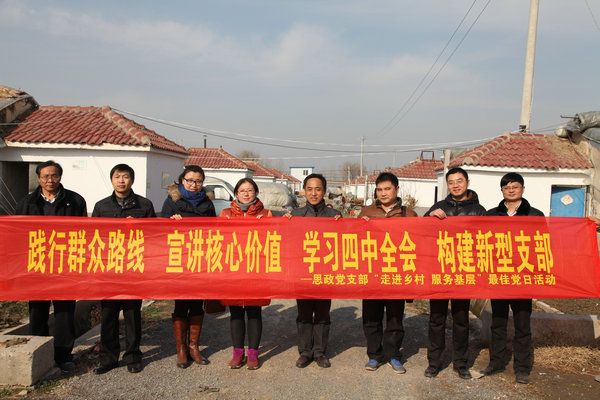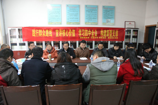 为了深入践行党的群众路线和社会主义核心价值观,学习贯彻党的十八届四中全会精神,不断推进学习型、服务型党支部建设,同时充分发挥支部优势,凝聚集体智慧,12月6日,思政党支部党员教师赴铜山区棠张镇跃进村开展最佳党日活动,本次活动以“践行群众路线、学习四中全会、宣讲核心价值、构建新型支部”为主题,以“走进乡村,服务基层”为中心。棠张镇跃进村主任马杰、村党支部副书记王娇,老党员代表陈振廷、郝世荣,以及大学生村官代表张文轩等参加了本次活动。
