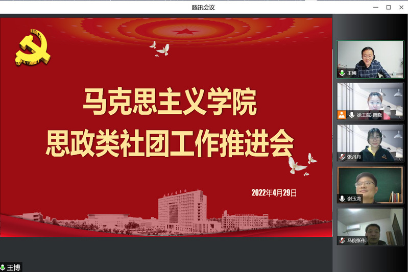 为贯彻落实《高校学生社团建设管理办法》精神,加强我校思政类大学生社团建设,充分发挥思政教师指导作用,4月29日晚,马克思主义学院召开线上思政类社团工作推进会,社团指导老师参加了会议,会议由马克思主义学院党总支书记王博主持。