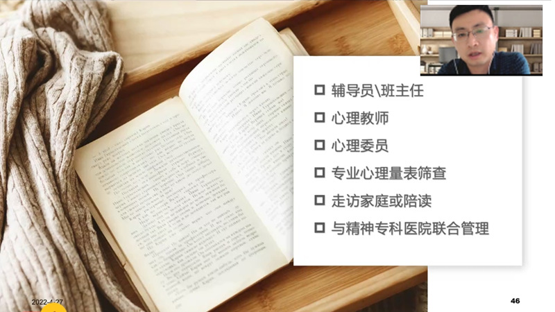 4月27日下午,我校邀请徐州市东方人民医院心理咨询与治疗中心副主任王佳佳开展“大学生心理健康问题早期识别与应对措施”专题讲座。全校辅导员、班主任共130余人参加此次讲座。王主任详细介绍了焦虑症、强迫症、精神分裂症、抑郁症等常见心理疾病的症状和表现,并结合中华人民共和国《精神卫生法》阐述心理危机应对措施。王主任的讲座聚焦当前学生心理工作实际,内容全面,参与学习的辅导员、班主任表示对于学生心理健康问题有了更加清晰的认识,有助于心理工作能力的提升。