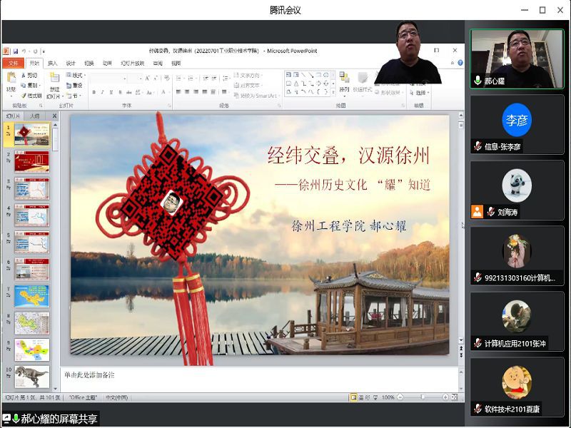 云端听看,坚定文化自信。7月1日正值香港回归25周年,党总支首先组织师生党员收看了庆祝香港回归25周年大会特别报道,感受了香港回归祖国25周年以来的繁荣发展和“一国两制”的伟大实践。随后,党总支邀请“徐博001号志愿讲解员”郝心耀为全体党员和学生代表开展了一次云端讲座。郝老师以“经纬交叠,汉源徐州”为主题,在风趣幽默的氛围中,围绕徐州的交通区位、历史变迁、历史名片、历史名人等专题,将徐州的辉煌历史徐徐道来。通过云端听看,师生们了解了“汉代三绝”等两汉文化的精髓,通过文物历史了解徐州文化,感受到了悠久厚重的人文历史。