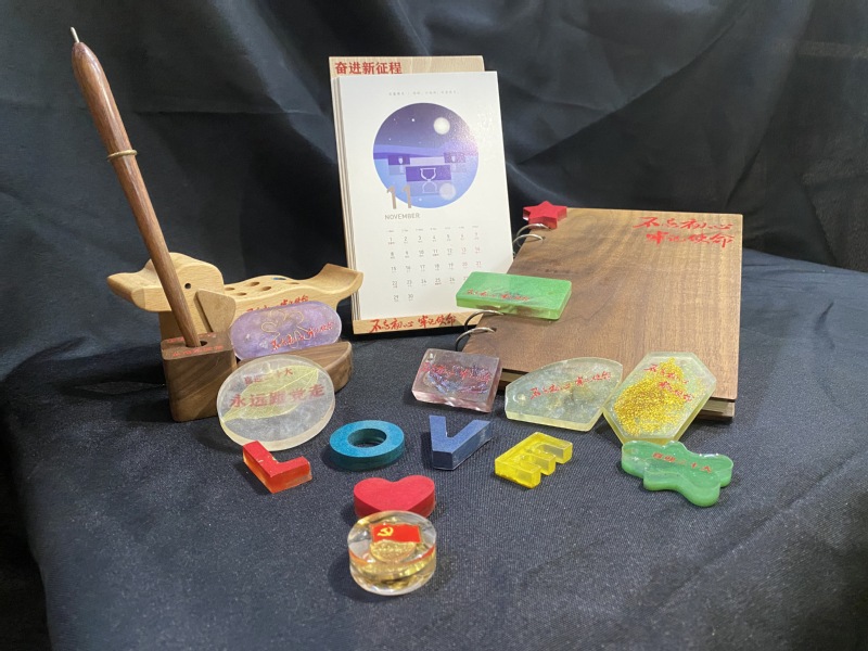 一套高分子材料红色文创产品,弘扬专业特色工匠精神。作为徐州工业职业技术学院特色专业高分子材料工程技术的青年学子,运用专业特长,结合红色文化,设计并制作出具有红色特色的高分子材料文创作品。他们结合树脂材料的特点,按照严格比例调配成最终的树脂胶,同时在浇筑模型上分别添加“不忘初心、牢记使命”、“喜迎二十大,永远跟党走,奋进新征程”等红色文字在作品上,经过一遍遍的仔细打磨,形成最终的作品。这一系列的过程无不体现着材料学子们运用专业所学展现出严谨认真、精益求精、追求完美的工匠精神,切实提高青年学子们社会化能力。