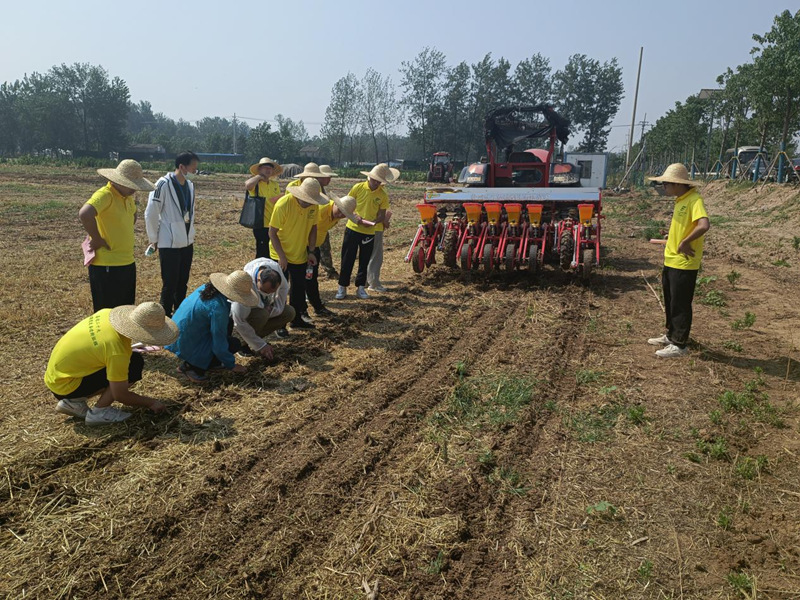 烈日炎炎,适逢夏粮播种,机电工程学院师生一行来到铜山区伊庄镇大豆玉米带状复合种植百亩示范片开展暑期“三下乡”社会实践活动,同学们在田间地头学习了国家农业发展相关政策、农业机械相关技术、新型农业播种方式,在田野大地上学习了一堂生动的国家粮食安全思政课。