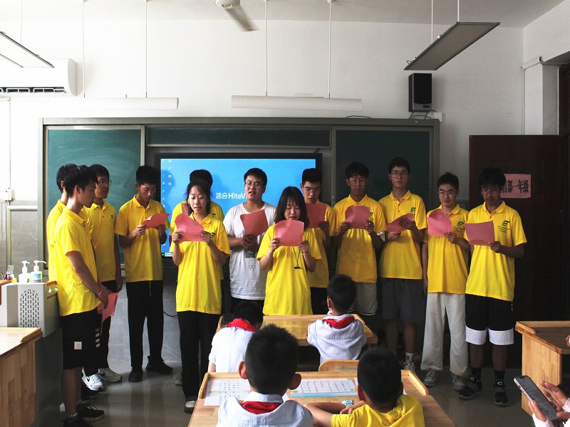 “心手相牵 阳光童行”关爱特殊儿童彩虹行动暑期社会实践共包括“彩虹红色课堂”、“彩虹爱心伴读”、“彩虹暖心有约”三个活动阶段。社会实践的第一阶段,实践团师生一行15人来到徐州市特殊教育学校,视障部常主任接待了实践团,并向大家介绍了视障儿童的基本情况。团总支书记黄媛媛老师介绍了“心手相牵 阳光童行”关爱特殊儿童彩虹行动相关活动内容。随后实践团成员进行“彩虹红色课堂”党史故事宣讲活动。前期志愿者们根据视障儿童身体条件,对《刑场上的婚礼》进行了精心的二次创作,现场他们声情并茂、惟妙惟肖的讲述,让大家的思绪一下子穿越到那个硝烟弥漫的峥嵘岁月,文雍、铁军把刑场当做新婚的礼堂,他们在刑场上讲出自己的爱与信仰。志愿者们通过宣讲党史故事,带领孩子们重温党的光辉历程,传承红色基因。