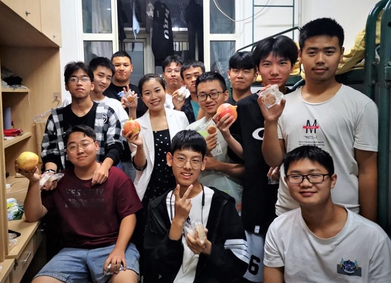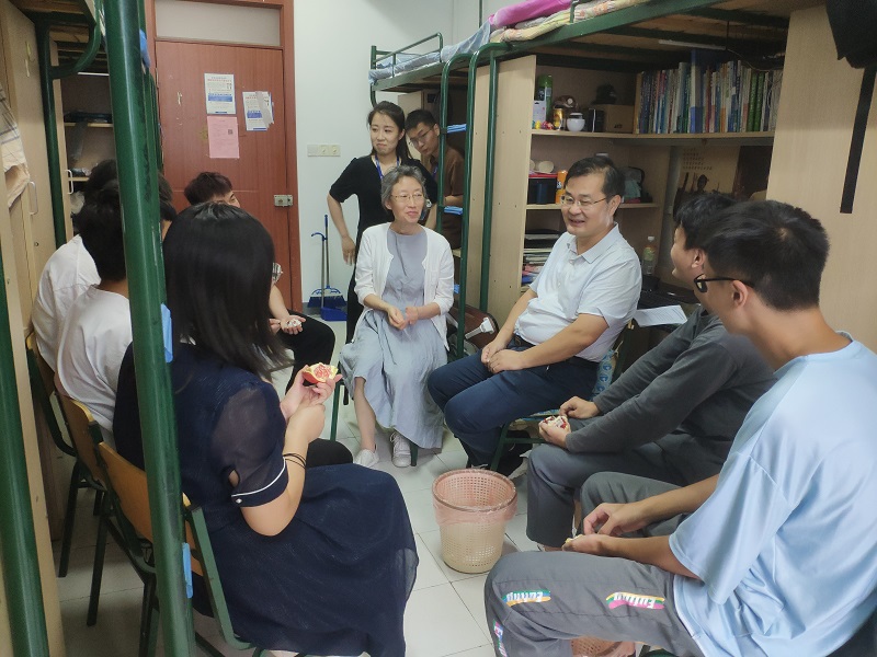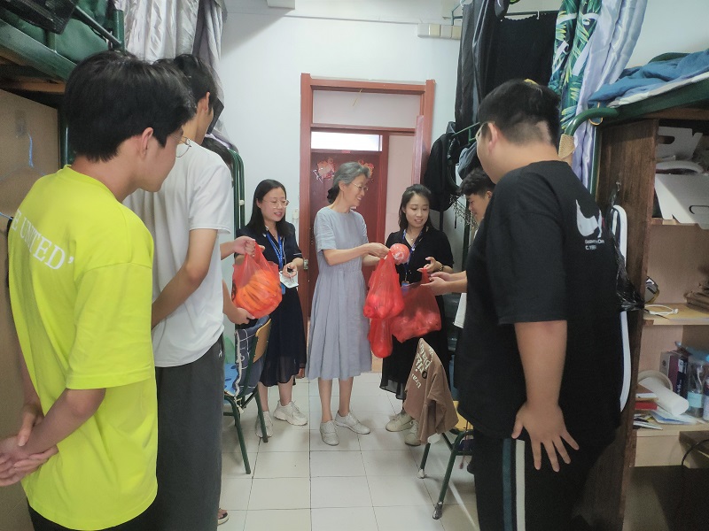 走访慰问彰显温情。9月9日下午,副院长张芳儒在化工学院党总支书记吴红,副书记郝红艳陪同下,深入学院学生宿舍,开展中秋走访慰问活动,为同学们送上了月饼和水果等慰问品,向同学们表达了节日的祝福和亲切关怀,详细询问了同学们在校期间的学习、生活、职业规划情况等,了解了同学们困难和诉求,勉励同学们做好学业规划和职业规划,珍惜大学时光和青春年华,练就过硬技能本领,为国家和社会做出积极贡献。今年的中秋节,学院为每个宿舍同学准备了特色礼物石榴,寓意着各民族同学、各班级各宿舍同学像石榴籽一样紧紧抱在一起。全体辅导员为各宿舍学生发放了石榴和月饼,送上了满满的祝福。酥香的月饼和美味的石榴吃在嘴里、甜在心里、乐在脸上,让在校同学感受到了来自学院的用心、关怀与温暖。