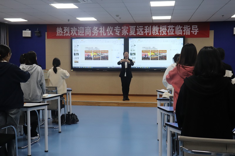 为提升国际学院学子的整体商务形象,增强同学们的文化素质修养,国际教育学院于11月12日上午在B18-505举办了一场别具一格、精彩绝伦的商务礼仪讲座。本次讲座的主讲人为江苏建筑职业技术学院的夏远利教授。夏教授为注册国际高级礼仪培训师,曾多次为省内外政府部门、旅游单位、高星级酒店及社会企业进行礼仪培训服务,教学及实践经验丰富。