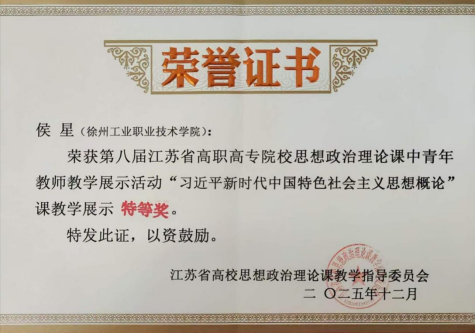 近日,第八届江苏省高职高专院校思想政治理论课中青年教师教学展示活动举行。本次活动由江苏省高校思政课教指委主办,全省94所高职院校近300名教师参赛。我校4名教师参赛,实现了全员、全赛道获奖,其中侯星老师荣获特等奖,赵欣、周晴老师分别荣获一等奖,吕梦老师荣获二等奖。