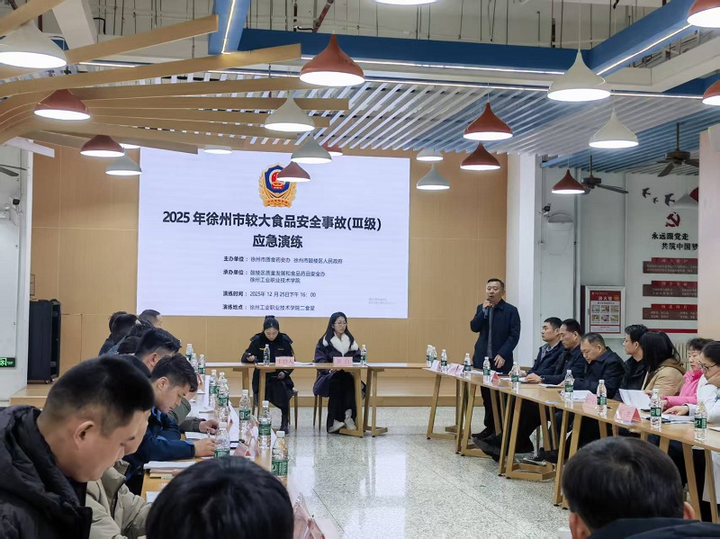 为深入贯彻落实食品安全“四个最严”要求,扎实推进食品安全“两个责任”工作,切实提升应对食品安全突发事件的快速响应、高效处置和协同作战能力,全力保障在校师生饮食安全,12月25日,由徐州市质食药安办、鼓楼区人民政府联合主办,鼓楼区质量发展和食品药品安全办、徐州工业职业技术学院共同承办的“2025年徐州市较大食品安全事故(Ⅲ级)应急演练”在我校成功举行。
