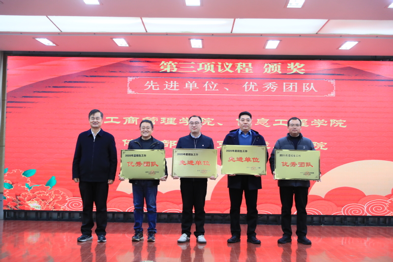 大会对2025年度招生工作先进单位、优秀团队及先进个人进行了表彰。侯亚合宣读表彰文件,张芳儒、杨宏楼为获奖代表颁奖。工商管理学院作为招生工作先进单位代表作了经验交流。