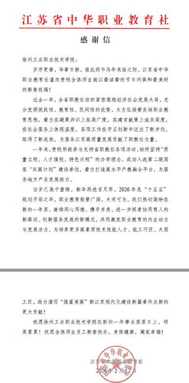 江苏省中华职业教育社在感谢信中提到,我校始终坚持“质量立校、人才强校、特色兴校”办学理念,成功入选第二期国家“双高计划”建设单位,积极打造高水平产教融合平台,服务地方产业发展成效显著。同时肯定学校积极参与职教社各项活动,大力弘扬黄炎培职业教育思想,打造高水平产教融合平台,为服务地方产业发展、助力江苏职业教育高质量发展贡献了重要力量。