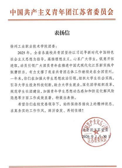 岁末年初,辞旧迎新之际,我校收到教育部财务司、共青团江苏省委、江苏省中华职业教育社发来的表扬信与感谢信,国家级、省级单位的接连肯定,既是对学校2025年办学治校各项工作的高度认可,更是对全校师生实干笃行的莫大鼓舞,充分彰显了学校在思想政治引领、教育财务管理、职教改革发展等方面的扎实成效与责任担当。