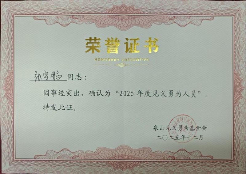 近日,徐州市泉山区见义勇为基金会正式授予我校化工与制药学院应用化工(3+3)2401班学生张宇鹏“见义勇为”荣誉称号,以表彰他在危急时刻挺身而出、英勇救人的先进事迹。