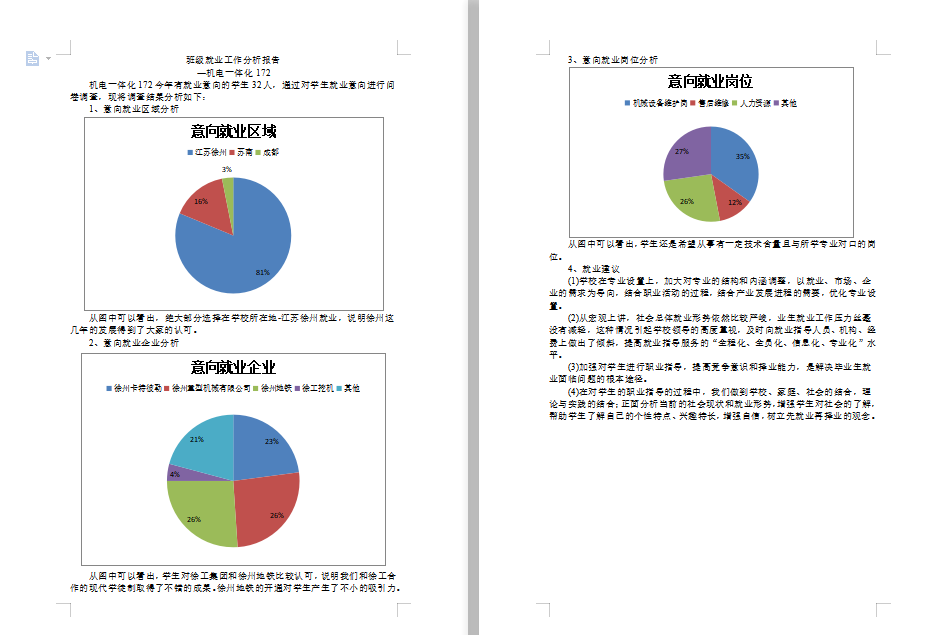 各毕业班班主任根据就业意向统计,撰写班级就业工作分析报告。在报告中详细阐述了班级整体的就业情况,以及部门学生面临的困惑和存在的问题;班主任通过各种方式教育引导学生在立足自己的价值取向、能力水平、兴趣爱好的基础上规划未来的职业发展历程,考虑到学生可能会遇到的助力及阻力,从而对自己的内、外环境的优势与劣势作进一步地详细估量,帮助学生设计出更契合自己职业生涯发展方案。