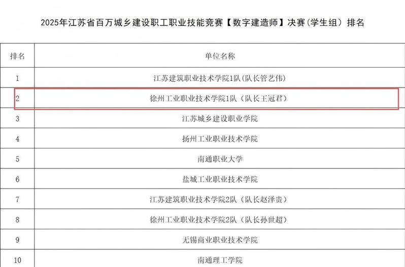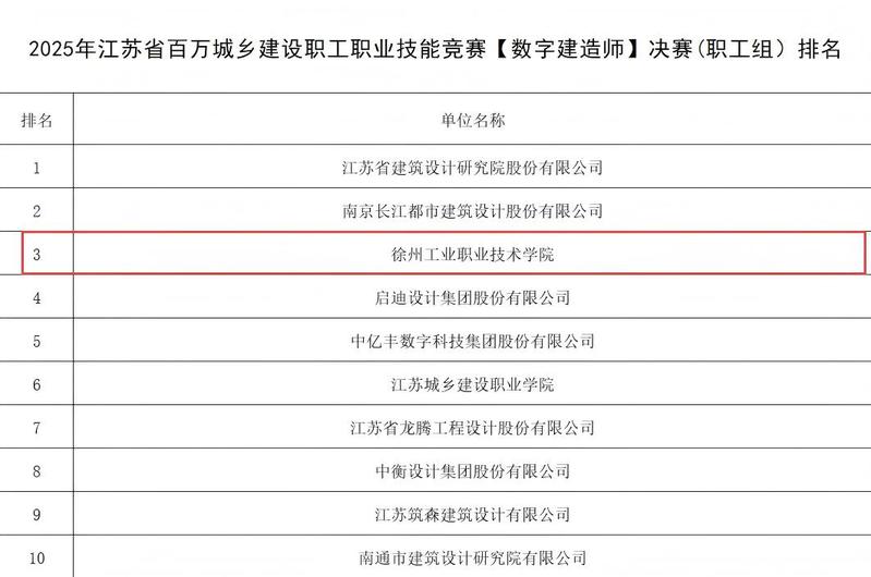 近日,2025年江苏省百万城乡建设职工职业技能竞赛“江苏建院杯”数字建造师决赛顺利落下帷幕。我校张睿、彭启超、张诺老师团队在职工组比赛中荣获二等奖,总成绩位列全省参赛职业院校教师第一名。李鹏、彭启超老师指导的王冠君、耿浩然、姬凯腾团队在学生组比赛中斩获全省第二名的优异成绩。