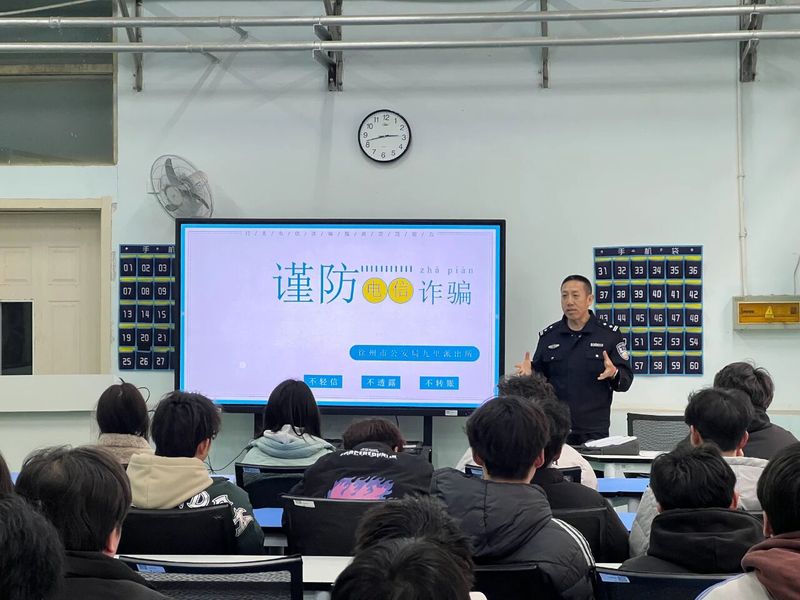 依托“化雨宣讲团”品牌矩阵,学校组建了由辅导员、学生骨干、受助学生代表、校资助宣传大使构成的宣讲队伍,打造“政策解读+案例警示+互动问答”三位一体的立体课堂。联合九里派出所成立“诚信教育共同体”,开展反诈专题讲座20余场,民警结合“校园贷陷阱”“征信修复骗局”等真实案例,揭秘新型诈骗手段,手把手传授“未知链接不点击、陌生来电不轻信、个人信息不透露、转账汇款多核实”的“三不一多”防诈口诀。活动覆盖全校80个班级,实现师生参与率100%,政策知晓率和诚信认知度显著提升。