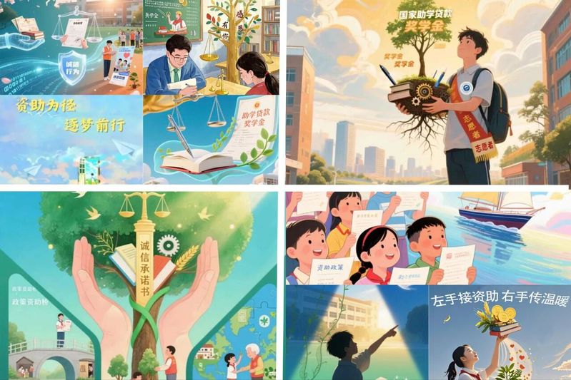 当“人工智能”遇见“诚信教育”,会碰撞出怎样的火花?学校举办AI诚信主题图片征集大赛,鼓励学生运用AI技术创作可视化作品。围绕“资助政策暖人心,诚信照亮人生路”等主题,学生们创作出《信用之树》《诚信星光照亮来时路》等45幅创意作品——有的以蓬勃生长的树形图案展现资助政策的惠民温度,有的通过科幻场景诠释诚信在智能时代的永恒价值。