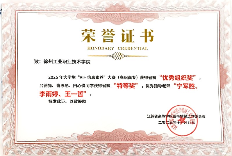近日,由教育部高等学校图书情报工作指导委员会指导,江苏省高职高专图工委主办的2025年江苏省大学生“AI+信息素养”大赛(高职高专赛道)圆满落幕。图文中心积极组织赛前培训与赛事服务工作,为参赛学生提供了有力保障。我校师生表现卓越,吕德隽、曹思形、田心悦三名同学荣获省赛特等奖。宁军胜、李雨婷、王一哲三名指导老师获评优秀指导教师。同时,因比赛成绩突出与组织得力,图文中心荣获“优秀组织奖”。