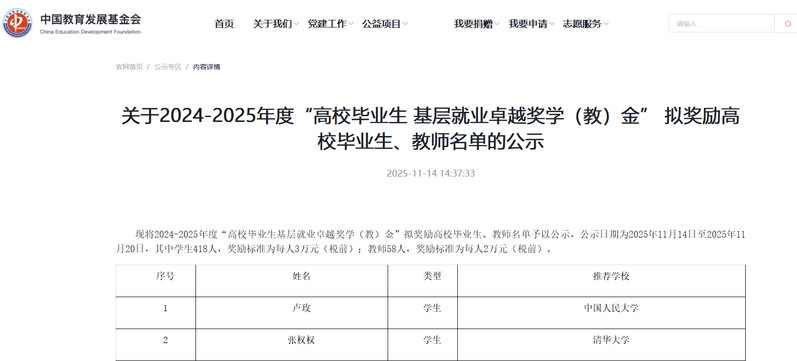 我校毕业生荣获高校毕业生基层就业卓越奖学(教)金